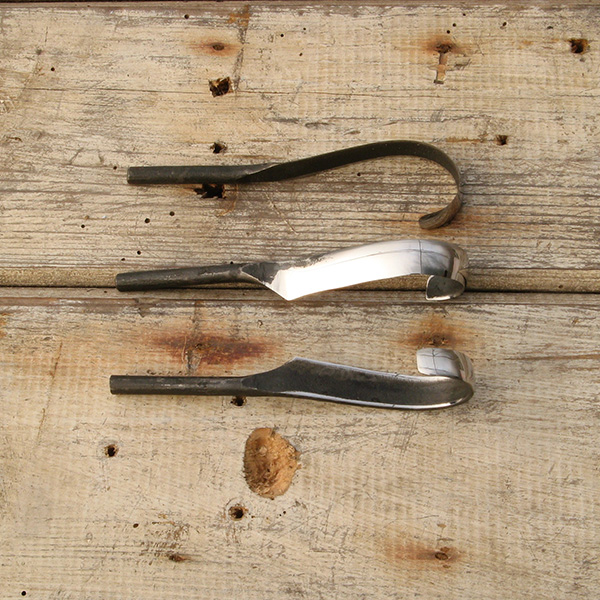 A spoon carving blade forged from round stock, concave on the inside for easier sharpening and more accurate edge geometry, convex outside for smooth hollowing. The compound curve on this blade makes it very versatile, the flatter section will smooth out a spoon bowl very well, but if the tighter curve near the tip is used then a deeper bowl can be hollowed.