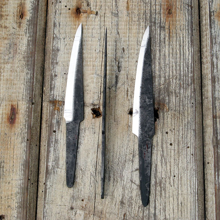 A forged blade suitable for greenwood carving, a forged distal taper means these bevels shorten towards the tip. Although the image shows the flat bevel option, I have been offering the hollow ground ( flat over hollow) version and it has proved to be so universally popular that unless you request a flat ground sloyd in the order notes I will send the hollow ground version.